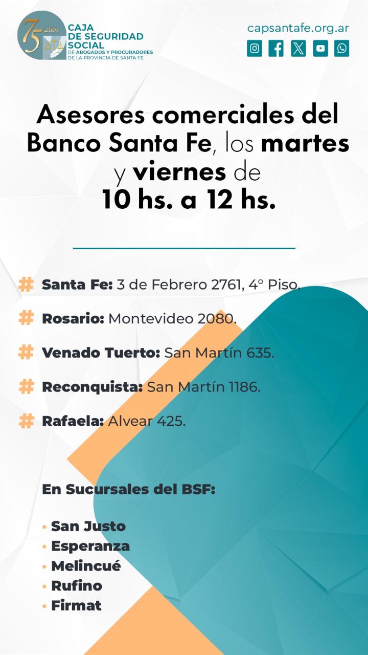 Martes y viernes de 10 a 12 hs. un asesor del Banco de Santa Fe estará disponible para ampliar límites de tu tarjeta de crédito y/o tramitarla a los efectos de que puedas acceder al plan de pago.