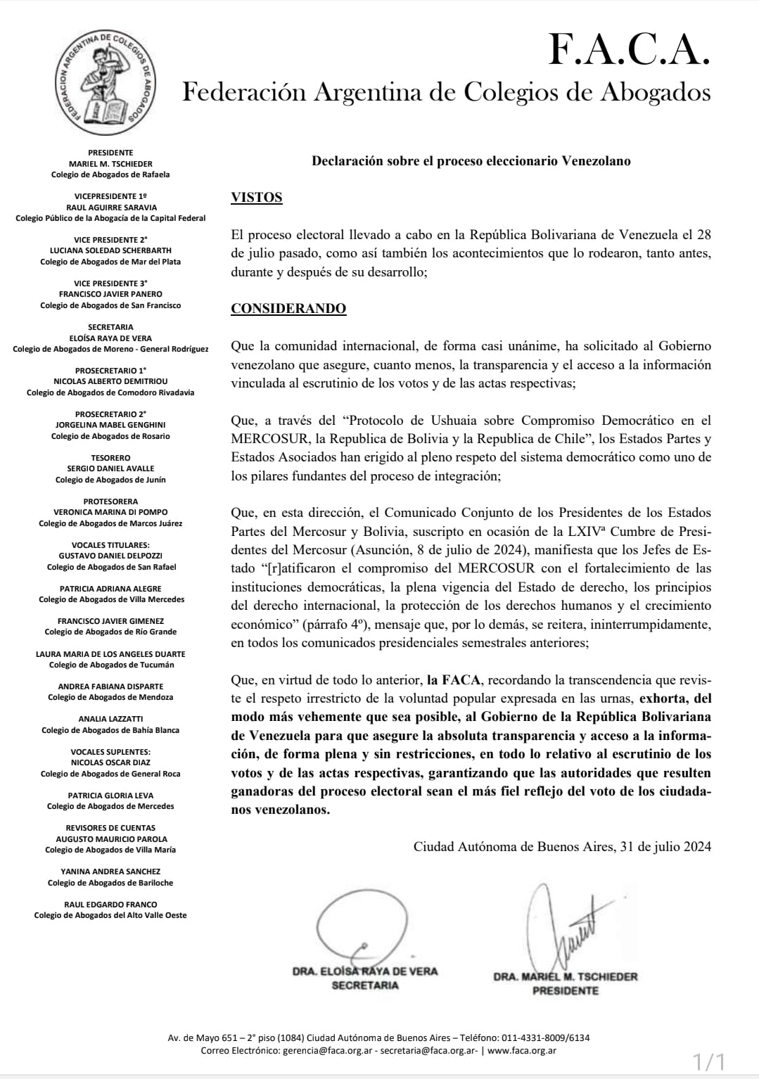 F.A.C.A - Declaración sobre el proceso eleccionario Venezolano - 31/07/2024